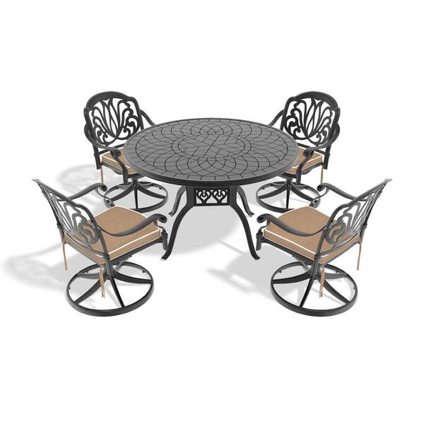Elizabeth 5-Piece Cast Aluminum Patio Outdoor Dining Set with Round Dining Table, 4 Swivel Chairs and 4 Brown Cushions