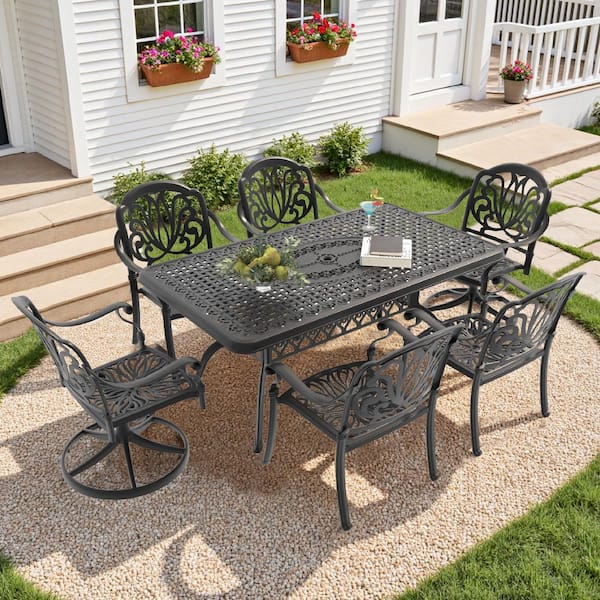 Elizabeth 7-Piece Cast Aluminum Outdoor Dining Set with Rectangular Table and Swivel Dining Chairs with Brown Cushion