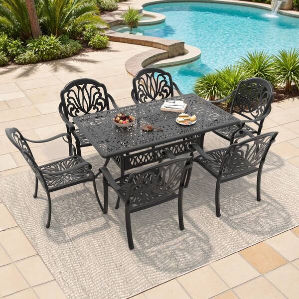 Elizabeth Black 7-Piece Cast Aluminum Outdoor Dining Set with Rectangle Table and Dining Chairs and Brown Cushion