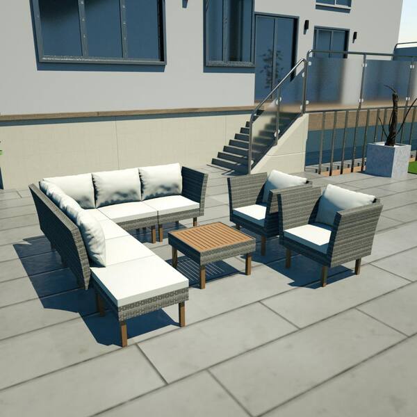 Gray 9-Piece Wicker Patio Conversation Sectional Seating Set with Beige Cushions