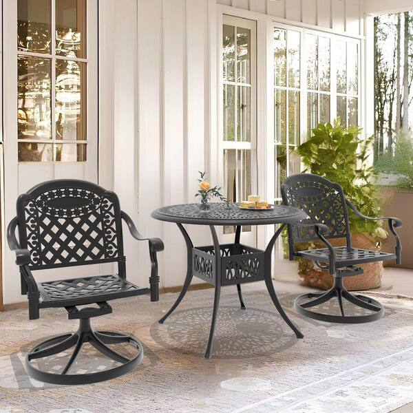 Isabella 3-Piece Cast Aluminum Patio Outdoor Dining Set with Round Dining Table, 2 Swivel Chairs and 2 Red Cushions