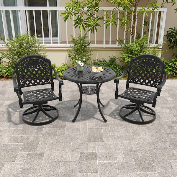 Isabella 3-Piece Cast Aluminum Patio Outdoor Dining Set with Round Dining Table, 2 Swivel Chairs and 2 Red Cushions