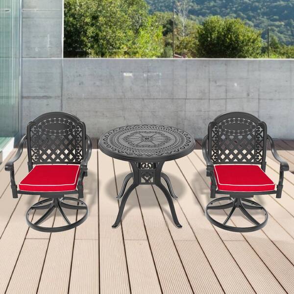 Isabella 3-Piece Cast Aluminum Patio Outdoor Dining Set with Round Dining Table, 2 Swivel Chairs and 2 Red Cushions