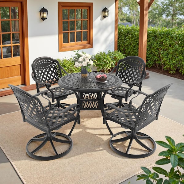 Isabella 5-Piece Cast Aluminum Patio Outdoor Dining Set with Round Dining Table, 4 Swivel Chairs and 4 Red Cushions