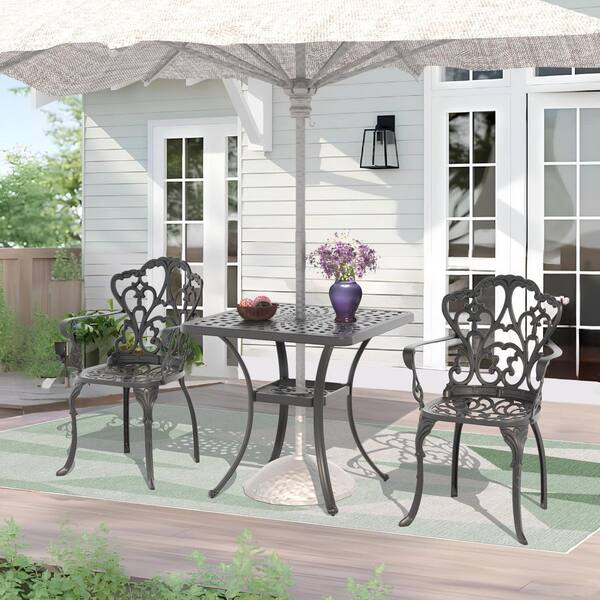 Lily Black 3-Piece Cast Aluminum Outdoor Dining Set with Square Table and Dining Chairs with Random Color Cushion