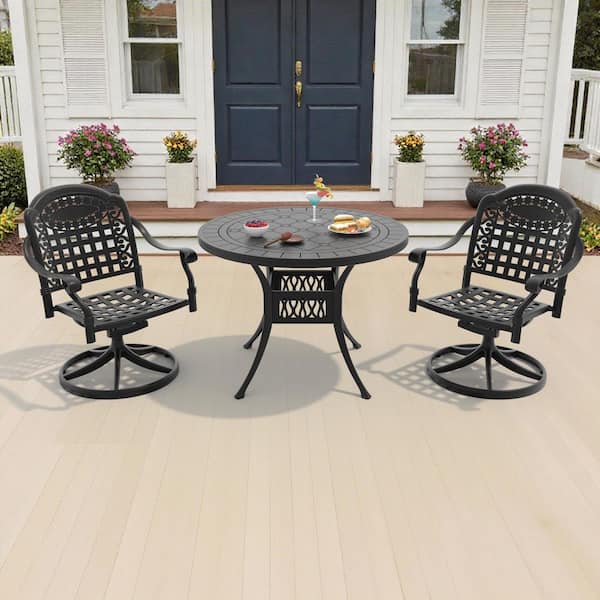 Vintage 3-Piece Cast Aluminum Patio Outdoor Dining Set with Round Dining Table, 2 Swivel Chairs and 2 Blue Cushions