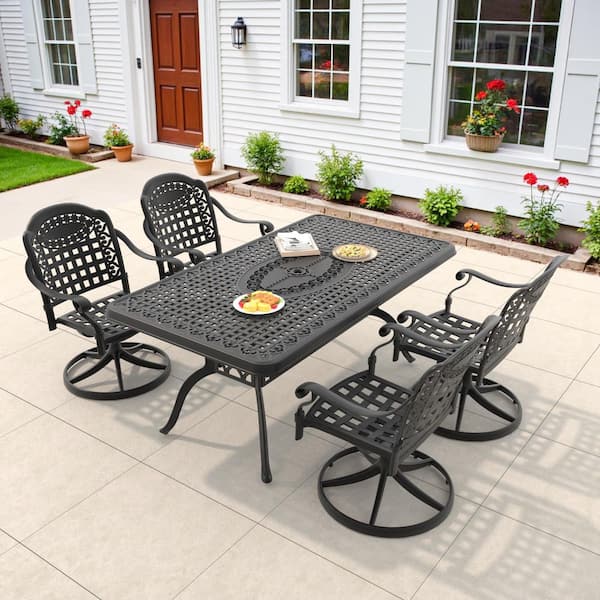 Vintage 5-Piece Cast Aluminum Patio Outdoor Dining Set with Rectangular Dining Table,4 Swivel Chairs and 4 Blue Cushions
