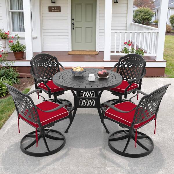 Vintage 5-Piece Cast Aluminum Patio Outdoor Dining Set with Round Dining Table, 4 Swivel Chairs and 4 Red Cushions