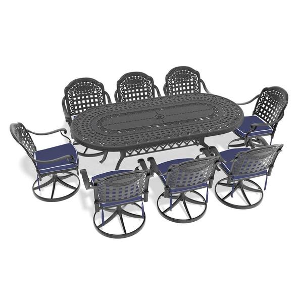 Vintage 9-Piece Cast Aluminum Patio Outdoor Dining Set with Oval Dining Table, 8 Swivel Chairs and 8 Blue Cushions