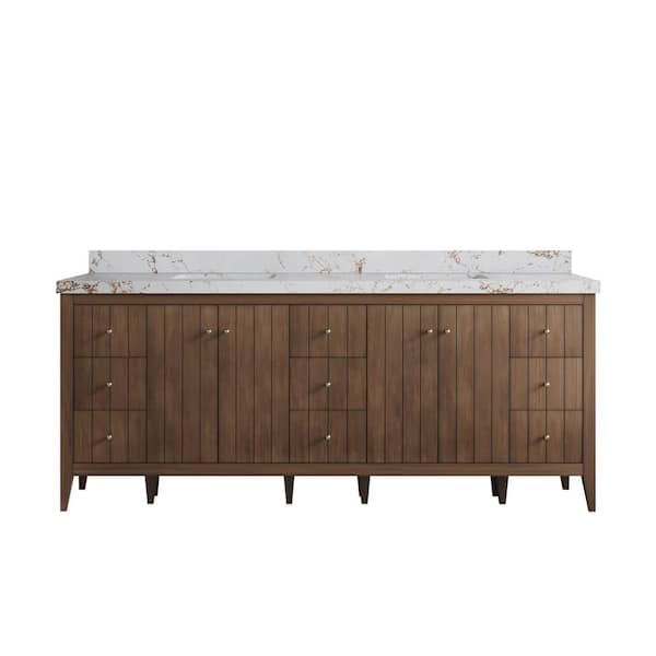 Atlanta Teak 84 in. Double Sink Freestanding Dark Natural Bath Vanity with Viola Gold Qt. Top Unassembled