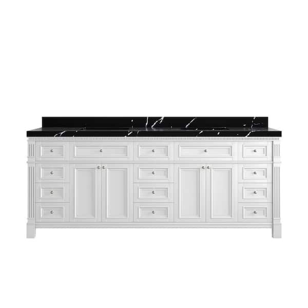 Paris 84 in. Double Sink Freestanding White Bath Vanity with Calacatta Black Qt. Top