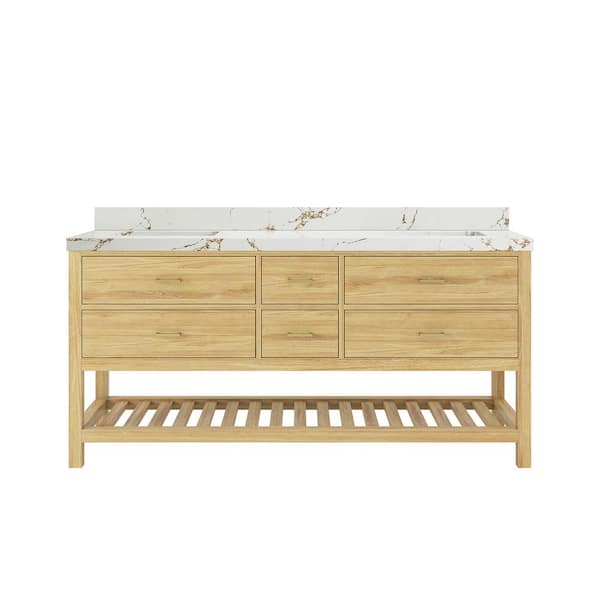 Parker Teak 72 in. Double Sink Freestanding Light Natural Bath Vanity with Viola Brown Quartz Top Unassembled