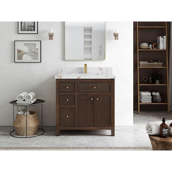 Sonoma Teak 36 in. Single Sink Freestanding Dark Walnut Bath Vanity with Viola Gold Qt. Top Unassembled
