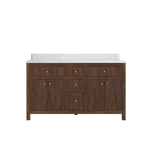 Sonoma Teak 60 in. Double Sink Freestanding Dark Walnut Bath Vanity with Empira White Quartz Top Unassembled