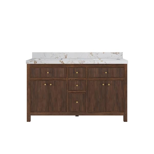 Sonoma Teak 60 in. Double Sink Freestanding Dark Walnut Bath Vanity with Viola Gold Quartz Top Unassembled