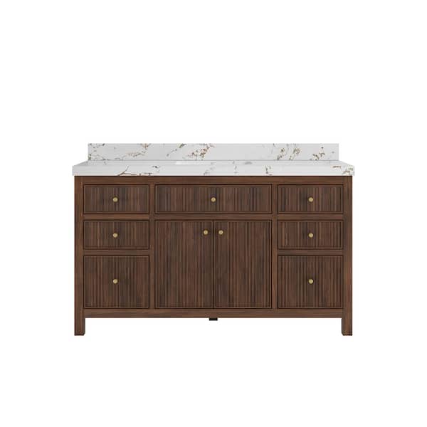 Sonoma Teak 60 in. Single Sink Freestanding Dark Walnut Bath Vanity with Viola Brown Quartz Top Unassembled