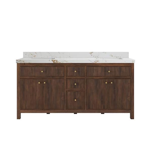 Sonoma Teak 72 in. Double Sink Freestanding Dark Walnut Bath Vanity with Viola Gold Quartz Top Unassembled