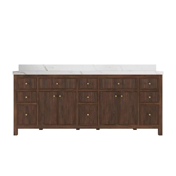 Sonoma Teak 84 in. Double Sink Freestanding Dark Walnut Bath Vanity with Calcutta Laza Quartz Top Unassembled