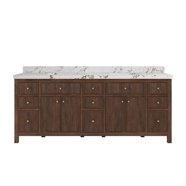 Sonoma Teak 84 in. Double Sink Freestanding Dark Walnut Bath Vanity with Viola Brown Quartz Top Unassembled