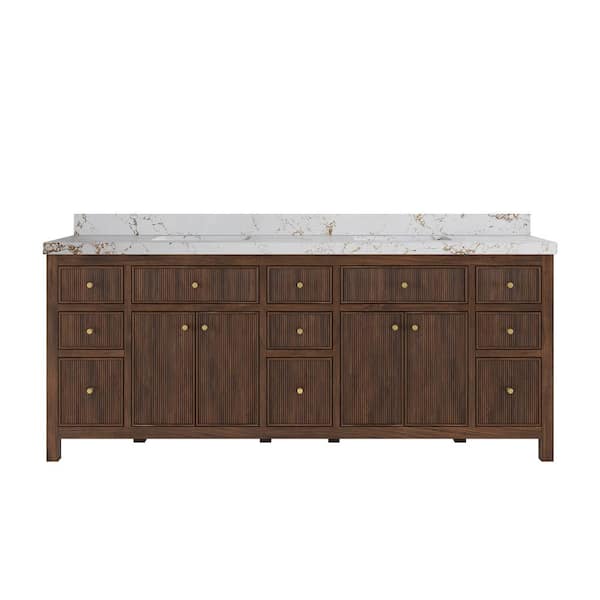 Sonoma Teak 84 in. Double Sink Freestanding Dark Walnut Bath Vanity with Viola Gold Qt. Top Unassembled