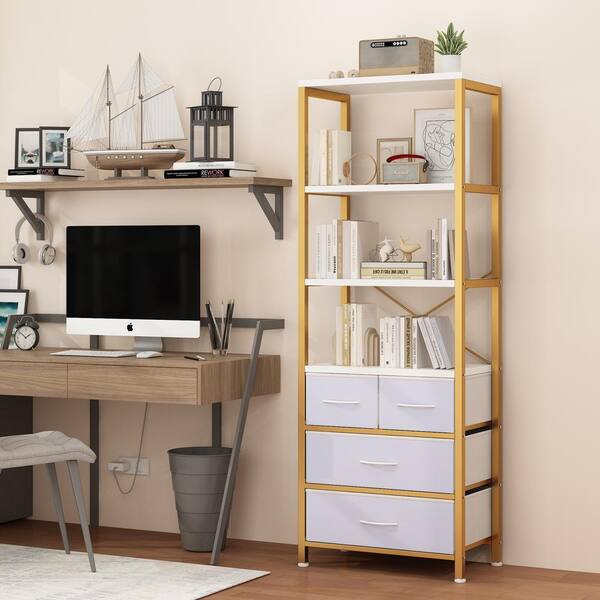 68.5 in. Tall White Particle Board Wood 6-Shelf Etagere Bookcase with 4-Drawers, Storage