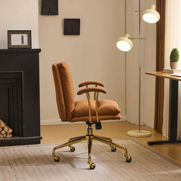 Frosted Leather Fabric Swivel Adiustable Height Task Chair in Brown with Golden Arm