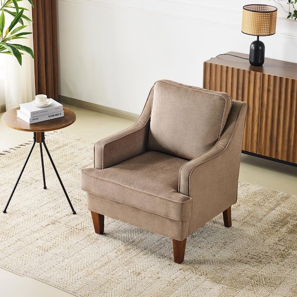 Light Brown Velvet Arm Chair with High Armrest T-Shaped Seat Cushion Solid Wood Legs