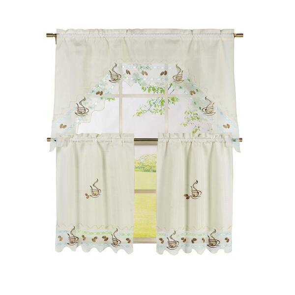 Semi-Opaque Coffee Talk Embroidered 3-Piece Kitchen Curtain Tier and Valance Set