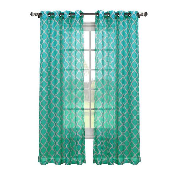Sheer Quatrafoil Printed Sheer Extra Wide 54 in. W x 84 in. L Grommet Curtain Panel in Turquoise/White