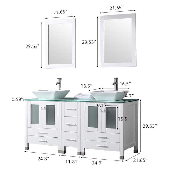 60.6 in. D x 21.3 in. W x 29.5 in.H Double Sink White Bathroom Vanity Big Storage Bathroom Vanity Green Glass Top Mirror