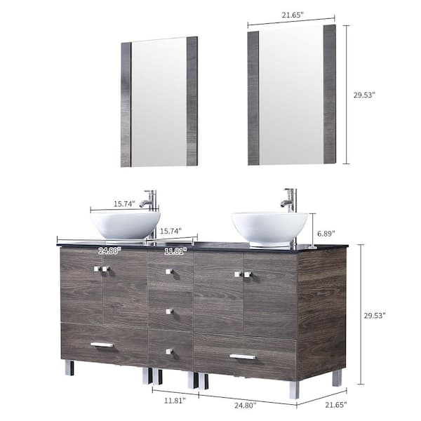60 in. Brown Bathroom Vanity Double Glass Top White Ceramic Sink Large Bathroom Storage Cabinet with Mirror