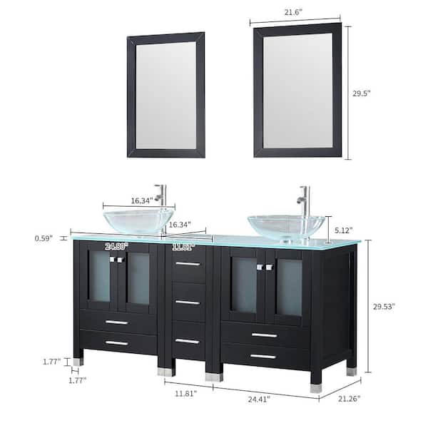 61 in. Double Tempered Glass Round Clear Sinks Freestanding Black Bath Vanity with Green Tempered Glass Tops and Mirrors