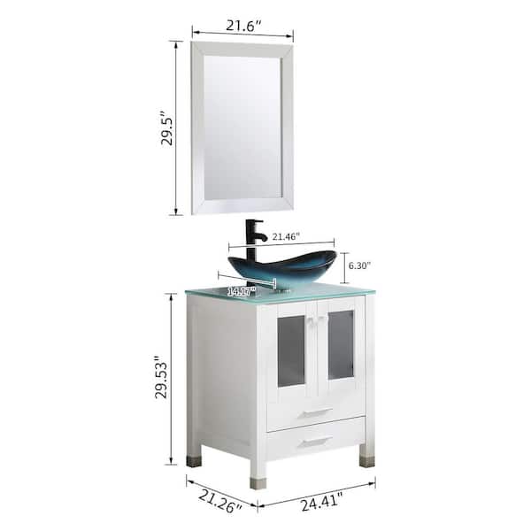 • Includes glass top, mirror, tempered glass sink and drain stopper