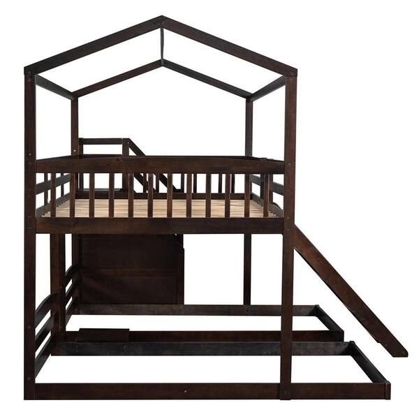 Wood Espresso Twin Bunk Bed with Slide and Storage Staircase, Built-in Drawer and Shelf