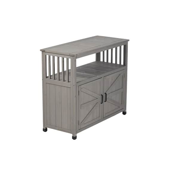 Wood Outdoor Patio Bar Table with Storage Cabinet and Open Shelves in Gray