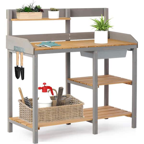 Wooden Potting Bench Table with Sink, Outdoor Garden Table Work Bench with Shelf, Workstation for Outside Lawn Patio