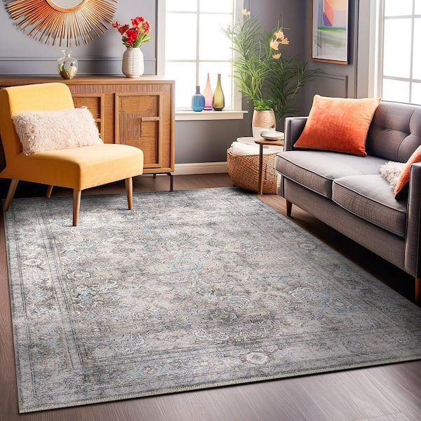 Transitional Distressed Vintage Machine Washable Olive 5 ft. x 7 ft. Area Rug