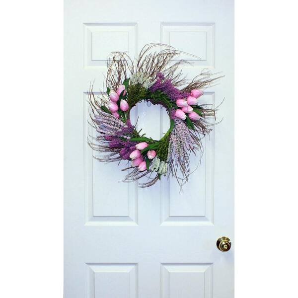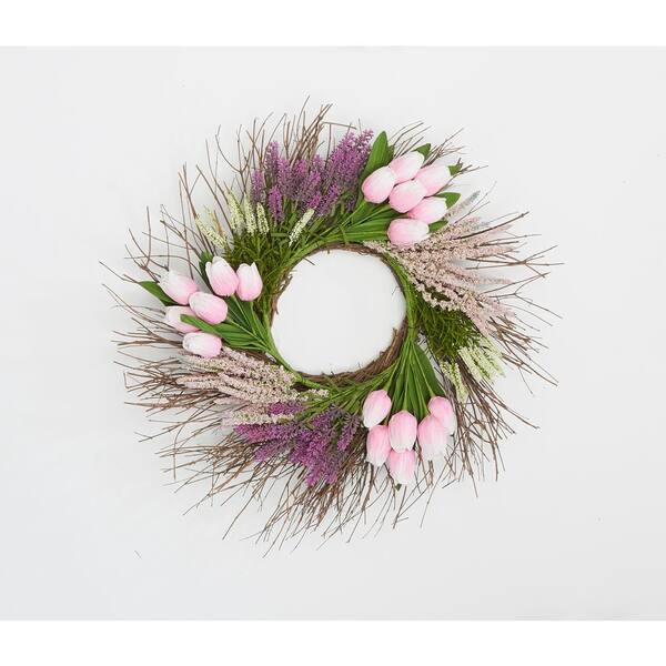 22 in. Artificial Tulip Heather Wreath on Natural Twig Base in Pink