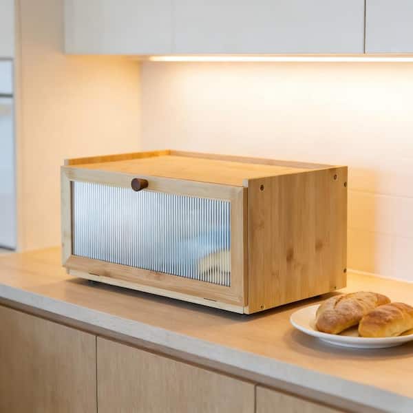 1-Piece Stackable Bamboo Bread Box Set, Large Capacity Bread Storage Container Farmhouse Bread Box with Window, Beige