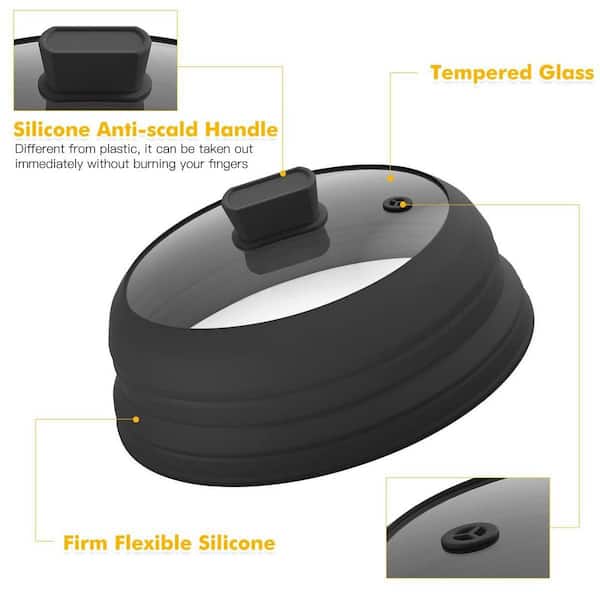 11.8 in. Black Glass Microwave Splatter Guard Lid with Collapsible Silicone for Food Pot Plate Cover