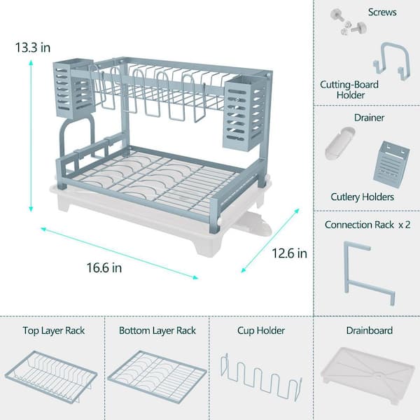 2-Tier Blue Dish Rack, Large Dish Drying Rack with Drainboard and Utensil Holders for Kitchen Counter