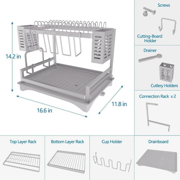 2-Tier Stainless Steel Dish Racks with Drainboard and Utensil Holders for Kitchen Counter and Sink, Silver