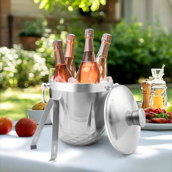 3 L Ice Buckets with Lid, Tongs and Strainer, Double Wall Stainless Steel Ice Bucket Keeps Frozen Longer, Silver