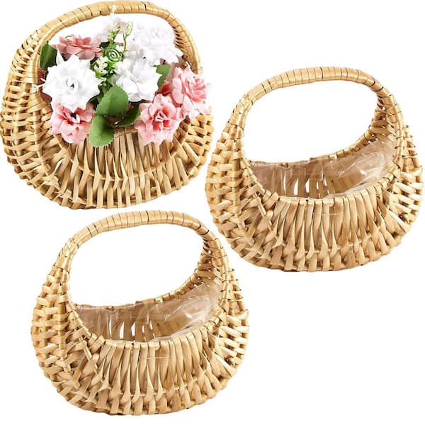 3-Pack Rattan Flower Girl Basket with Handle, Natural Half Moon Straw Wicker Basket for Wedding Flower Girl and Picnic