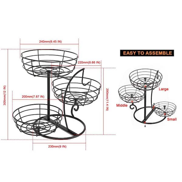 3-Tier Black Fruit Basket Bowl with Banana Hanger, Fruit Storage Basket with Metal Base for Kitchen Counter