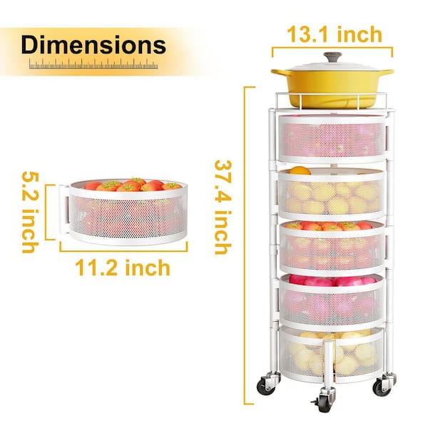 5-Tier Fruit and Vegetable Basket Bowls for Kitchen with Metal Top Lid, Rotating Storage Rack Cart on Wheels in White