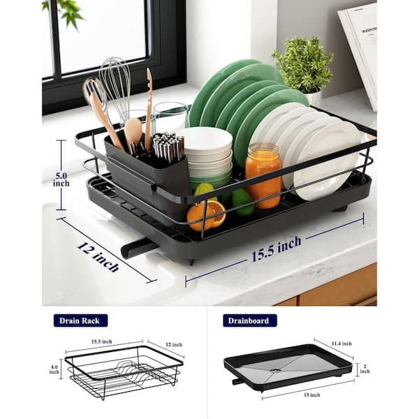 Black Dish Drying Rack for Kitchen Counter, Rust Resistant Metal Sink Organization and Storage Rack with Cutlery Holder