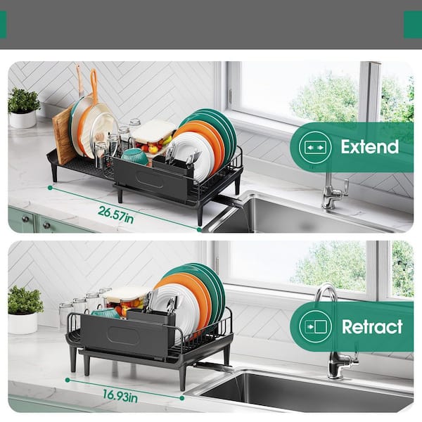 Black Extendable Dish Drying Rack for Kitchen Counter, Large Expandable Dish Rack with Drainboard for Pan Pot