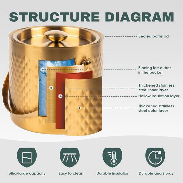 Double Wall Insulated 3L Stainless Steel Gold Ice Bucket with Airtight Lid and Scoop, Bar Cart Accessories