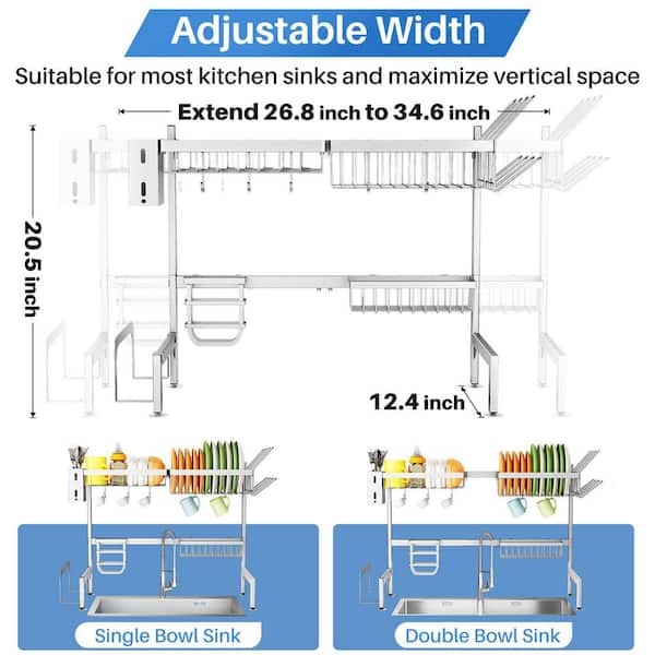 Over The Sink Extendable Drainer Drying Dish Rack in Silver with Adjustable Basket, Utensil Holder and Sponge Holder
